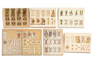 ENSEMBLE DE CARTES À JOUER - XIXe siècle. Jeu complet de 40 cartes Napolitain. - XIXe siècle. Jeu espagnol complet de 48 cartes par J. Ruiz, J. Altarriba and J. Fonseca. - 1810. Jeu espagnol complet de 48 cartes Espagnol par José Martinez de Castro, Madrid. - XIXe siècle. Jeu italien complet de 52 cartes, numéral par G.ANTo. Lordschneider, à Trieste. - XVIIIe siècle: Epreuve tirée sur bois original donné au Docteur Michelin par Fanjoux. S'y ajoutent 105 cartes espagnoles éditées en 1758 par Langlois et d'autres par Tourcaty
