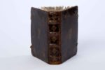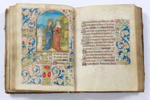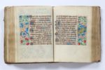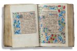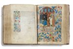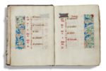 [MANUSCRIT ENLUMINÉ DU XVe SIÈCLE]. [NORMANDIE] Heures à l'usage de Rouen, nord de la France, fin du XVe siècle, vers 1470. Volume de 180 × 142 × 50 mm, [143] feuillets de velin. Page: 173 × 130. Calendrier: marge inf. 50 mm; sup. 21 mm; int. 25 mm; ext. 42 mm; surface d'écriture: 92 × 65 mm, une colonne de 16 lignes, interligne 6 mm. Heures: marge inf. 50 à 55 mm; sup. 28 mm; int. 20 mm; ext. 40 mm; surface d'écriture: 92 × 65 mm, une colonne de 15 lignes. Encre brune et rouge. Quelques feuillets manquants. Reliure veau brun glacé XVIIe siècle, dos à 4 nerfs, fleurons dorés, plats bordés de 2 filets avec fleurons angulaires et au centre en fleurons le motif d'une croix avec instruments de la Passion, le tout doré, tranches dorées, restes de fermoirs (défauts dont fentes aux mors, coins émoussés, griffures superf. aux plats). Calendrier (f. 1r-12v). Le calendrier (complet), rédigé en français, suit l'usage du diocèse de Rouen. On y relève d'abord le nom de saint Sever (1er février), signalé dans un bréviaire à l'usage de Rouen du XVe siècle (Leroq. B. 539) qui commémore également sainte Austreberte le 10 du même mois. Sainte Honorine (28 février) est fêtée le 27 dans quatre bréviaires à l'usage de Bayeux, Coutances et Sées au XVe siècle (Leroq. B.572, B.571, B.631, B.661). Saint Valery (1er avril) est mentionné dans plusieurs manuscrits rouennais du XVe siècle, de même que saint Eutrope (30 avril) (Leroq. M.725, M.724, Lat. 1334). La translation des reliques de saint Ouen (5 mai) confirme l'usage du diocèse de Rouen, ainsi que saint Didier (23 mai) qui apparaît dans un bréviaire, un diurnal et trois missels à l'usage de Rouen et Lisieux (Leroq. B.539, Lat. 1323, M.725, M.724, M.248, Lat. 1334). Heures de la Vierge (f. 27r-): matines (f. 27r-38r); laudes (f. 38v- 50r) [f. 50 feuillet vierge, réglé, margée ornée]; prime (f. 51r-57r); tierce (f. 57r-64r); none (f. 64r-67v) [f. 68: feuillet vierge, réglé, marges ornées]; vêpres [début manquant]; suite du psaume 122, 4 (f. 69r); complies (f. 74r- 78v) [début manquant]; psaume 13 (f. 74r); [f. 79 vierge, réglé, marges ornées]; f. 80r suite du psaume 6; litanies (f. 92v-95v); [f. 96 vierge, réglé, marges ornées]. Heures de la Croix (f. 97r-103r): matines (f. 97r-98r); prime (f. 98r-100r) [f. 100v vierge, réglé, marges ornées]; f. 101r suite de la prière au Saint-Esprit « Et renovabis faciem terrae ». Heures des défunts (f. 104r-143v) [f. 142v-143v vierges, réglés, marges ornées]. Décor Le calendrier s'orne de 12 lettrines peintes à l'encre d'or sur fond bleu et pourpre, rehaussé de blanc (environ 30 × 12 mm). La marge externe est garnie d'un décor de rinceaux bleus et or, alternant avec des enroulements floraux et des baies sauvages (90 × 25 à 100 × 30 mm). 8 grandes lettrines indiquent le début des principales sections de l'office (25 × 20 à 32 × 25 mm). Peintes à fond d'or, elles se composent de décors de cuirs enroulés bleu pâle et pourpre, et accueillent un décor de grappes et de végétaux. 120 lettrines de taille moyenne (17 × 12 mm) ponctuent le texte, marquant le début des psaumes et des oraisons; de petites lettrines (12 × 7 mm) embellissent enfin l'initiale de chaque verset. Plusieurs feuillets présentent en outre des ornements marginaux en pleine page (f. 17r, 74r). Au fils des marges, tapissées de rinceaux bleu et or alternant avec des jonchées d'oeillets, se découpent des écussons à fond d'or de formes variées, abritant des bouquets de pensées, de violettes et de fraises. Le goût pour ces ornements, relativement fréquents dans les productions parisiennes de la fin du XVe siècle, semble avoir été suscité par le rayonnement d'ateliers renommés tel que celui du Maître du cardinal de Bourbon, actif entre 1470 et 1500 (Autun, BM, ms. S. 191; Paris, BnF, ms. Smith-Lesouëf 24). Le décor se complète de cinq miniatures (86 × 65 mm) inscrites dans des encadrements quadrangulaires cintrés, entourés de marges fleuries couvrant une pleine page (155 × 111 mm). Les Heures de la Vierge s'ouvrent sur l'image de l'Annonciation, qui accompagne les matines (f. 27r); la Visitation précède les laudes (f. 38v) et la Nativité, prime (f. 51r). Les matines de la Croix sont ornées d'une Crucifixion (f. 97r) et l'office des défunts, d'une représentation des funérailles (f. 104r). Le traitement des visages, aux traits allongés et peu différenciés, n'est pas sans évoquer la touche du Maître de Philippe de Croÿ (Université de Liège ms. Wittert 14), quoique la palette et le traitement des drapés s'en distinguent. De même, les tons verts et bruns du paysage offrent des nuances similaires à celle de plusieurs miniatures exécutées dans l'entourage de cet enlumineur. Saint Taurin d'Évreux (11 avril) figure dans cinq manuscrits à l'usage d'Avranches, de Coutances et de Rouen à la même époque (Leroq. B.661, B.660, M.725, M.724, Lat. 1334). La fête de saint Just (19 octobre) n'apparaît que dans u