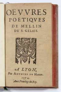 [LIVRE DU XVIe SIÈCLE]. SAINT-GELAIS (Mellin de) Oeuvres poëtiques de Mellin de S. Gelais. À Lyon, par Antoine de Harsy, 1574. In-12, [9] f. (dont privil.), 246 p., velin XIXe s., dos lisse, titre en noir, tranches rouges (velin grisé, taches p.19-21, 75-78). (USTC 29161, 6 ex.; Brunet V, 46)