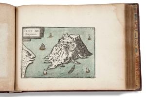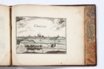 [ATLAS]. TASSIN (Christophe) Les plans et profils de toutes les principales villes et lieux considérables de France. Ensemble les cartes générales de chacune province; et les particulières de chaque gouvernement d'icelle. Paris, Jean Messager, 1636. 10 parties en 1 vol. in-4 oblong (17,5 x 24 cm. hors reliure), 44 p., [219] feuillets gravés, maroquin rouge époque, dos à 5 nerfs, titre doré, caissons ornés, multiple filet doré encadrant les plats, roulettes dorées sur les coupes, tranches dorées (dos remplacé, les fragments d'origine remontés, restauration au plat inf., frott. et taches aux plats, qq. f. brunis, défauts marginaux, dont des mouill., des travaux de vers sur la marge inf, des pl. 24-37 de la partie Languedoc, et des minuscules piq. sur les pl. de la partie Foix et Béarn; 11 pl. en déficit dans la dernière partie). Seconde partie de cet important atlas illustrant l'ensemble du royaume de France au début du XVIIe siècle. Consacrée à la partie méridionale du pays, elle se compose de 10 parties, précédées de 44 pages de texte (dont le titre), et couvre les régions suivantes: Bourgogne: 24 planches, dont titre, table et une carte générale de la France. - Dauphiné: 40 pl. (dont titre et table). Provence: 19 pl. (dont titre et table). - Orange & Comtat Venaissin: 5 pl. (dont titre). - Languedoc: [1] f. titre, 46 pl. (dont table). - Foix et Béarn: 7 pl. (dont titre). - Guyenne: 23 pl. (dont titre et table). - Poitou: 26 pl. (dont titre et table). - Rivière de Loire: [2] f. (titre, table), 17 pl. - Beauce: 9 pl. sur 18 (dont titre et table; il manque 11 planches à cette partie). Table manuscrite ancienne sur un feuillet de garde et prolongée sur la page de titre; anciennes annotations dans le texte général qui renvoient aux planches. L'ensemble des feuillets (titre, tables, et planches) ont été anciennement numérotés en continu à l'encre, de 1 à 219. (Pastoureau, Tassin VIII Bb)