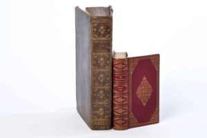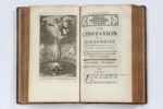 CORNEILLE (Pierre) L[']Imitation de Jésus Christ mise en vers françois... Imprimé à Rouen, par L. Maurry, pour Robert Balard... À Paris, 1656. Petit in-12 étroit (106x54 mm.), [8] f. (dont le titre illustré), 507 p., [2] f. (privil.), maroquin rouge, dos à 5 nerfs ornés d'un pointillé doré, titre, lieu et date dorés, caissons ornés aux petits fers et bordés d'un double filet doré, plats bordés d'un triple filet et d'une ligne de pointillés, avec grands fers angulaires et médaillon central, le tout doré, double filet doré aux coupes, dentelle intérieure, tranches dorées [Capé]. Première édition dans ce format de poche et comprenant les quatre livres. Elle est illustrée de figures gravées sur cuivre en regard chaque chapitre, dues à François Campion et Jérome David, et certaines anonymes; le titre typographié est également orné d'une gravure. Bel exemplaire lavé (un nom ancien ms. encore visible en tête du titre) et soigneusement établi par Capé. (De Backer 2733; Picot 129). On joint [LE MAISTRE DE SACY (Isaac Louis)]. De l'Imitation de Jesus- Christ. Traduction nouvelle. Par le sieur De Beuil, prieur de Saint Val. Nouvelle édition. À Paris, chez G. Desprez et P.G Cavellier, 1745. In-12, [2] f., LX-451 p., fr., pl., maroquin vert bronze époque, dos lisse orné aux petits fers et filets dorés, titre doré, triple filet doré aux plats, roulette intérieure, tranches dorées (défauts dont 3 coins émoussés, accroc au bord du plat sup.; rouss. et qq. taches). L'illustration gravée sur cuivre se compose d'1 frontispice et de 4 planches numérotées de 2 à 5, non signées. Ces planches sont des copies des éditions précédentes gr. par K. Audran, d'après L. Baugin pour le frontispice et les pl. I, III, IV; et par A. Bosse d'après Ph. de Champaigne, pour le livre II. Soit 2 volumes