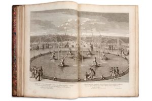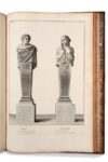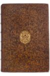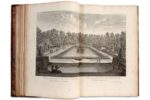 [RELIURE AUX ARMES]. [GRAVURE]. [VERSAILLES]. SILVESTRE (Israël), LEPAUTRE (Jean) Recueil composé de 104 grandes planches gravées sur cuivre à la fin du XVIIe siècle, la plupart par I. Silvestre ou J. Lepautre, illustrant le parc et le château de Versailles. In-folio, veau brun époque, dos à 6 nerfs, pièce de titre maroquin rouge, caissons ornés, tranches dorées, armes dorées aux plats (défauts dont coins usés, une coiffe arasée, mors en partie fendus; rouss. et brunissures marginales). 1 plan non signé publié par Demortain. - 12 planches dessinées et gravées par Israël Silvestre (plan, perspectives et vues des jardins et édifices), datées entre 1664 et 1684. - 3 planches gravées par Lepautre. - 9 planches publiées par Le Blond concernant l'orangerie et les écuries, dont un plan de jardin de l'orangerie avec pièces mobiles. - 1 petite vue de la grande écurie publiée par Langlois, contrecollée. - 21 planches de sculptures, gravées par Audran ou Edelinck, datées entre 1679 et 1681. - 18 planches de fontaines, gravées par Lepautre datées entre 1673 et 1679. - 2 planches doubles de fontaines, l'une par Simonneau d'après Cotelle, 1689, l'autre dessinée et gravée par L. de Chastillon, 1683. - 9 planches de bustes sur colonnes, par Lepautre, 1674. - 6 planches de pots à fleurs et 2 de sphinx, par Lepautre, 1672-1673. Et enfin l'ouvrage de FÉLIBIEN, Description de la grotte de Versailles, Paris, Impr. royale, 1679, [1] f., 11 p., 20 planches par Lepautre, Picart, Chauveau (mouillure au titre et en marge des pl.). En toute fin, 2 gravures non signées, montrant l'intérieur et le profil de la Chapelle royale. PROVENANCE N. Delpech, marquis de Méréville, conseiller au Parlement de Paris (armes aux plats, OHR 392). (Brunet, I, 1442-1443)