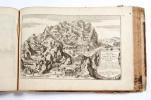 [ATLAS]. FER (Nicolas de) [Atlas curieux. Première partie (?)]. Paris, l'auteur, v. 1700 - 1705. In-folio oblong, veau brun époque, dos à 5 nerfs, pièce de titre grenat, coins renforcés de parchemin de réemploi (rel. usée, coiffes arrachées, lacunes de couvrure; brunissures et rousseurs sporadiques, taches d'encre sur une tranche, non collationné). Exemplaire comprenant plus de 100 feuillets: des feuillets de texte typographiés, des planches gravées (vues, plans, et cartes aux limites coloriées), l'ensemble anciennement numéroté à la main de 7 à 116, avec des bis. Il manque le début, il n'y a pas de titre et la première planche porte le n°7
