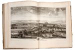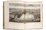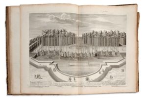 [VERSAILLES]. [DEMOARTAIN, éd.] Les plans, profils, et élévations des ville, et château de Versailles, avec les bosquets et fontaines... levez sur les lieus, dessinez et graves en 1714 et 1715... À Paris, chez Demortain, [vers 1716]. In-folio, demi-velin vert fin XIXe s. (dos décolé et presque entièrement manquant; qq. bruniss. et défauts en marges, 5 pl. en déficit). Recueil entièrement gravé composé de [2] f (titre, privilège, placé à la fin), [49 (sur 54 ?)] planches gravées sur cuivre, non numérotées, certaines doubles ou dépliantes, dont des vues dessinées et gravées par P. Menant, des vues de fontaine d'après Girard, fontainier du roi, des plans, des vues d'édifices par Aveline, etc., et un grand plan dépliant sur plusieurs feuilles assemblées, par Pierre Lepautre, daté 1717. S'y ajoutent à la fin 8 planches 3 000 - 4 000 dessinées et gravées par Israël Silvestre, de la suite « Les plaisirs de l'île enchantée » (mouillures claires sur ces pl.), soit au total 57 planches. La description de ce recueil donnée par Cohen (col. 808) mentionne 54 planches. La suite de Silvestre semble ne pas en faire partie, et certaines planches de cet exemplaire n'appartiennent peut-être pas à l'ouvrage. Néanmoins l'ensemble offre un très beau panorama des jardins de Versailles et de leurs ornements