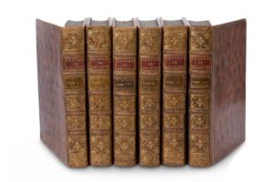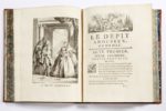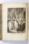 MOLIÈRE / Oeuvres de Molire. Nouvelle édition. À Paris, s.n., 1734 [au colophon: De l'imprimerie de P. Prault, 1733]. 6 volumes in-4, veau écaille époque, dos à 5 nerfs, pièce de titre rouge, et de tomaison havane, caissons ornés, triple filet doré aux plats, double filet aux coupes, tranches bleues marbrées (frottements sans gravité aux coupes, coins et mors, petites épidermures aux plats de quelques tomes, rousseurs et brunissures éparses, quelques feuillets uniformément brunis). Édition illustrée d'un portrait de Molière par Coypel gravé par Lépicié, de 33 planches par Laurent Cars d'après Boucher, et de près de 200 bandeaux et culs-de-lampe, certains répétés. « Le chef-d'oeuvre de Boucher comme illustration et probablement la plus belle édition illustrée du théâtre de Molière; c'est l'un des plus beaux livres de la première partie du XVIIIe siècle » (Cohen). Exemplaire de second tirage, relié avec élégance et grand de marges (h = 29 cm. hors reliure). (Cohen 712)