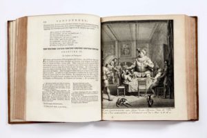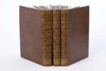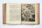 RABELAIS (François) / Oeuvres. Avec des remarques historiques et critiques de M. Le Duchat. À Amsterdam, chez Jean Frédéric Bernard, 1741. 3 vol. in-4, veau havane moucheté époque, dos à 5 nerfs, pièces de titre et de tomaisons fauve, caissons ornés, triple filet à froid bordant les plats, roulette dorée aux coupes, tranches jaspées, des coiffes restaurées (accroc à 2 coiffes, légers frottements; certaines pl. brunies). La plus belle des éditions de Rabelais au XVIIIe siècle, dont l'illustration se compose de: un très beau frontispice allégorique avec le portrait de l'auteur en médaillon, au tome 2; un titre gravé par Picard répété aux tomes 1 et 3; un portrait de l'auteur par Tanjé, 12 figures par Du Bourg, 3 vues de la Devinière, et une carte dépliante, une figure gravée de la Bouteille, 12 vignettes et 12 culs-de-lampe. PROVENANCE P. Guirouard-Bonnaire (étiquette XXe s.); petit cachet rouge dans le style japanisant début XXe s. au faux-titre du t.1. (Cohen 840)