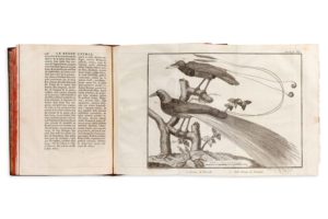 BRISSON (Mathurin-Jacques) Ornithologie, ou méthode contenant la division des oiseaux en ordres, sections, genres, espèces et leurs variétés. Paris, Cl. J.-B. Bauche, 1760. 6 volumes in-4, basane havane mouchetée époque, dos à 5 nerfs, pièce de titre fauve, tomaison frappée sur fond noir, caissons ornés, tranches rouges, restaurations (mouillures sporadiques affectant le papier aux t.1, 2, et en fin du t.3). Édition originale de cet important traité d'ornithologie illustré de 261 planches représentant plus de 500 espèces d'oiseaux, ainsi qu'un titre-frontispice répété dans chaque volume, le tout dessiné et gravé en taille-douce François-Nicolas Martinet. PROVENANCE A.J. de Porchon de Bonval, attaché à la capitainerie royale des chasses de Vincennes et de Livry, 18e s. (ex-libris gravé armorié). (Nissen IVB, n°145, Anker 69)