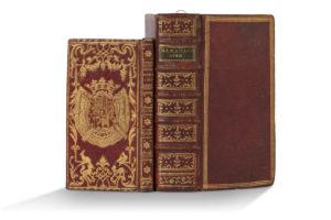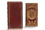 [RELIURE AUX ARMES] Ensemble de deux almanachs. 1. Le Calendrier de la cour... imprimé pour la famille royale et Maison de Sa Majesté. Paris, Collombat, 1763. In-18, maroquin rouge, dos à nerfs orné, plats décorés d'une plaque avec grands armes au centre. Aux armes de Charles de Rohan, prince de Soubise (1715-1787). 2. Almanach royal, année bissextile 1780. In-24, maroquin rouge époque, dos à nerfs, tranches dorées. Soit 2 volumes