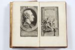 MARMONTEL (Jean François) / Contes moraux. À Paris, chez J. Merlin, 1765. 3 volumes in-8, maroquin rouge, dos à 5 nerfs ornés d'un pointillé doré, auteur, titre, tomaison, lieu et date dorés, caissons ornés aux petits fers, plats bordés d'un triple filet avec fleurons angulaires, le tout doré, double filet doré aux coupes, dentelle intérieure, tranches dorées [Mercier] (infimes frott. aux coupes en pied, rares rousseurs). Belle édition illustrée d'un portrait en frontispice gravé par Saint-Aubin d'après Cochin, un titre gravé par Duclos d'après Gravelot répété dans chaque volume, et 23 planches gravées sur cuivre d'après Gravelot, par Baquoy, Legrand, Le Mire, Le Veau, de Longueil, Pasquier, Rousseau et Voyez. « Les figures de Gravelot sont parmi les plus jolies que ce maître ait produites. » (Cohen). Bel exemplaire très bien relié et grand de marges (h = 188 mm. hors reliure). (Cohen 686-687)