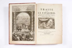 DRUMMOND DE MELFORT Traité sur la cavalerie. À Paris, de l'Impr. de G. Desprez, 1776. Deux volumes, texte et planches. Édition originale. Le volume de texte est illustré d'un frontispice dessiné et gravé par Ingouf l'aîné, 1 vignette sur le titre, 4 en-têtes et 3 culs-delampe, le tout par Van Balrenberghe gravé par Macret, Beurlier et Pruneau, et 11 planches gravées d'après Dupuis; l'atlas est illustré d'une vignette sur le titre gravée par J.P. Le Bas d'après Parrocel, et renferme 32 planches gravées d'après les dessins de Van Blarenberghe, et 22 figures gravées à 2 par planche d'après Parrocel et Coquart, ainsi qu'un feuillet de table. Vol. de texte in-folio, XXII p. (dont faux-titre et titre), [1] f. (souscripteurs), 505 p., [1] f. (privil., avis au relieur), fr., pl., fig., basane rouge vers 1900, dos à 5 nerfs, auteur, titre et roulettes dorées, non rogné, tranches latérales dorées sur témoins (défauts dont éraflures et frottements, coiffe de tête fendue, auréoles claires et brunissures sporadiques). Vol. de planches grand in-folio (env. 64 x 48 cm.), demi-chagrin grenat à bandes vers 1900, plats en basane rouge, dos à 6 nerfs, auteur, titre, fleurons et roulettes dorés (coiffe de tête arrachée, mors sup. fendu en queue, éraflures; qq. rousseurs, manque sur une planche en-dehors de la figure). (Mennessier de la Lance, 409)