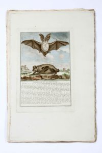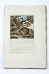 BUCHOZ (Pierre-Joseph) Histoire générale des animaux, des végétaux, et des minéraux qui se trouvent dans le royaume... Partie Ire représentant les quadrupèdes de la France. À Paris, chez l'auteur et chez De Bure l'aîné, [vers 1780]. In-folio, [1] f. (titre gravé), 40 planches gravées, en feuilles sous chemise moderne (menus défauts dans quelques marges). Belle suite, très rare, publiée à ses frais par Pierre-Joseph Buchoz (ou Buch'oz, 1731-1807). Il semble que ce travail soit demeuré inachevé, et nous n'avons pas de certitude sur le nombre exact de planches réalisées. Cet exemplaire renferme 40 planches dont 21 signée par De Sève, et parmi celles-ci, une numérotée XXXI (castor); et 19 planches numérotées de B à U. Soit 59 planches qui ne proviennent peut-être pas de la même suite mais sont de facture similaire. Chaque planche est divisée en deux parties, la moitié haute occupée par la figure et la moitié basse par un texte gravé. Tiré sur un beau papier vergé. Feuilles non rognées à droite, d'env. 50 x 30 cm. gravures texte compris env. 29 x 18 cm