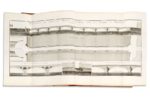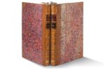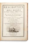 PERRONET (Jean Rodolphe) Description des projets et de la construction des ponts de Neuilly, de Mantes, d'Orléans et autres, du projet du canal de Bourgogne... et de celui de la conduite des eaux de l'Yvette et de la Bièvre à Paris. À Paris, de l'Imprimerie Royale, 1782-1783. Deux volumes in-folio, [6] f., 112 p. + [3] f., 154 p., [1] f. (avis au relieur), fr., pl., demi-basane fauve à coins pastiche, dos à 6 nerfs, pièce de titre aubergine, tomaison frappée sur fond noir, fleurons dorés, tranches rouges (2 coiffes arasées, trav. de vers en tête et queue des dos, coins un peu frottés; pl. IX reliée après XI et pl. XIV après XVIII; certaines pages un peu brunies, mouill. angulaire très claire en marge du t.2, des rouss. marg. sans gravité). Édition originale de cet ouvrage précurseur du point de vue technique, et d'une qualité éditoriale luxueuse. Tiré sur papier vergé fort, grand de marges, son illustration entièrement gravée sur cuivre se compose du portrait de l'auteur en frontispice gravé par A. de Saint Aubin d'après C. N. Cochin, et 67 planches, la plupart doubles (num. I-LXVI et XXXIXbis), montrant des vues des ponts et des détails de leur réalisation