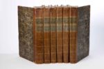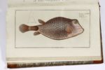 BLOCH (Marcus Elieser) / Ichthyologie ou Histoire naturelle, générale et particulière des poissons. Avec des figures enluminées, dessinées d'après nature. À Berlin, chez l'auteur, et chez F. de La Garde, 1785-1797. 12 parties en 6 volumes in-folio, basane à coins fauve de l'époque, dos lisse, pièces de titre et tomaison vertes, roulette dorée, filet doré sur le dos et plats (frottements avec qq. pertes, accroc a la coiffe sup. du vol.2, mors sup. du même vol. lég. fendu en queue, coins émoussés, defauts marginaux très discrets à l'intérieur sur qq. pages dont des salissures et petites déch., avec de très rares mq. seulement en marge; saliss. en fin des vol. 4 et 5, rapport de condition sur demande). Première édition en français de l'un des livres les plus spectaculaires et les plus documentés publiés sur les poissons. C'est l'oeuvre majeure de Marcus Elieser Bloch (1723-1799), médecin et naturaliste allemand. Traduction donnée par Jean Charles Thie?bault de Laveaux, sur l'originale en allemand intitulée Allgemeine Naturgeschichte der Fische, paru entre 1785 et 1795. L'adresse varie au cours de la publication. L'illustration se compose de 432 planches gravées et coloriées. Les graveurs Ludwig Schmidt, F. Berger, P. Haas et Moritz Bodenehr les ont réalisées d'après les dessins de J. F. Hennig, Kru?ger Jumn., Printz Moritz, et Pater Plumier. Les pages de titre sont illustrées de vignettes gravées sur cuivre, la plupart gravées par D. Berger d'après F.C.W. Rosenberg. Les planches portent le nom du spécimen représenté en latin, français, anglais et allemand. Un portrait de l'auteur est joint, volant, gravé par B. H. Bendix et B. Berger d'après le peintre Graff (Berlin, 1794). (Wood, Vertebrate zoology, p. 244, « One of the early and fundamental treatises on general ichtyology by a well-known authority »; Nissen, ZBI, 416)