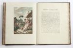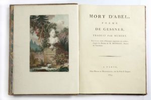 GESSNER (Salomon) / Mort d'Abel, poëme de Gessner, traduit par Hubert. Dessins de M. Monsiau, Peintre de l'Académie. À Paris, chez Defer de Maisonneuve, 1793. Grand in-4, 161 p., veau raciné époque, dos lisse ornés de roulettes et fleurons dorés, pièce de titre rouge, deux roulettes dorées bordant les plats, double filet doré aux coupes, roulette intérieure, tranches dorées (défauts dont coins usés, coiffes arrachées). Édition orné d'un frontispice comportant le portrait de l'auteur, et de 5 planches, le tout gravé d'après les dessins du peintre Monsiau, et imprimé en couleurs. Exemplaire dont les planches sont avant les numéros, et grand de marges. (Cohen, 436)