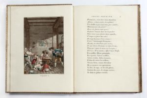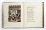 VADÉ (Jean-Joseph); LÉCLUSE (Henry de) / Oeuvres poissardes de J.-J. Vadé, suivies de celles de l'Écluse... À Paris, chez Defer de Maisonneuve, Imprimerie de Didot le jeune, an IV - 1796. Grand in-4, [4] f., 167 p., pl., veau raciné époque, dos lisse orné, pièce de titre rouge, plats encadrés de 2 roulettes et d'un filet dorés, double filet doré aux coupes, roulette intérieure, tranches dorées (2 coins émoussés; petite mouillure angul. en marge de 2 pl.). Édition très soignée tirée à 300 exemplaires, illustrée de 4 planches gravées et tirées en couleurs d'après les compositions du peintre Nicolas-André Monsiau (1754-1837). D'après Cohen, les gravures sont de Clément, dont le nom figure seulement sur la première planche de notre exemplaire, la seconde est signée « L. f. », et les deux dernières non signées. Texte sur papier vélin, planches sur papier vélin fort. (Cohen, 1005)