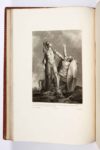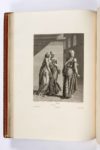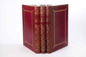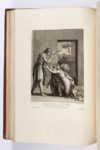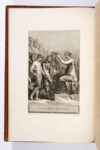 RACINE (Jean) / Oeuvres. Paris: Pierre Didot l'aîné, an IX - 1801. 3 vol. grand in-folio, maroquin rouge, dos à 6 nerfs saillants, auteur, titre, tomaison, lieu et date dorés, caissons ornés aux petits fers, plats décorés à la Duseuil, le tout doré, double filet aux nerfs, coupes et coiffes, contreplats bordés de maroquin orné d'une roulette et de filets dorés, tranches dorées sur marbrure, étuis [Belz- Niedrée] (étuis frottés; accroc superf. au dos du t.2, légers frott. aux coupes, nerfs, mors inf. du tome 3). « Sans contredit, cette édition est un des livres les plus magnifiques que la typographie d'aucun pays eut encore produits » (Brunet, IV, 1079). L'illustration se compose 57 planches gravées sur cuivre par Langlois, Massard, Chatillon et autre d'après Girodet, Gerard, Chaudet, Moite, Peyron... dont un frontispice gravé par Marais d'après Prudhon. Très bel exemplaire à grandes marges d'un tirage limité à 250 exemplaires, celui-ci le n° 100, avec la signature à l'encre noire de P. Didot l'aîné à la justification reliée à la fin du tome I