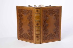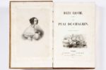BALZAC (Honoré de) / La peau de chagrin. Etudes sociales. Paris, Delloye et Lecou, 1838. Grand in-8, [2] f., 402 p., [1] f. (table), pl., fig., veau havane époque, dos à 4 nerfs plats, auteur et titre dorés, fleurons et filets dorés et à froid, plats bordés d'un listel et d'un filet dorés et orné d'une grande plaque rocaille à froid, double filet doré aux coupes, roulette intérieure, tranches dorées (qq. frott. aux coins et coupes, fente réparée en queue d'un mors sur 2 cm., rouss. éparses modérées). Premier tirage de cette édition illustrée d'une centaine de vignettes gravées sur acier, notamment d'après Gavarni, Janet Lange, Johannot, Raffet, Thomas, Langlois, Baron. Deux portrait horstexte sur Chine appliqué. Vignette de titre au squelette. Le portrait du jardinier placé page 301. Bel exemplaire dans une reliure romantique soignée. PROVENANCE Van Sikele, Belgique (Gand), XXe s. (ex-libris armorié). (Carteret III, 41)