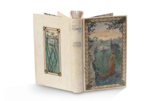 ROSTAND (Edmond) Les Musardises, Les Songe-creux, Poésies diverses, Le Livre de l'Aimée. Paris, Alphonse Lemerre, 1890. In-12, vélin ivoire à la Bradel époque, dos lisse, plats illustrés de compositions à la gouache, tranches dorées. Édition originale. Exemplaire signé par Edmond Rostand et décoré de 4 aquarelles originales par Eugène Grivaz (1852-1915). Jolie reliure en vélin illustrée de gouaches signées « I. Burch » représentant une jeune femme dans un parc peinte dans le style préraphaëlite sur le plat supérieur, et des nénuphars sur le plat inférieur