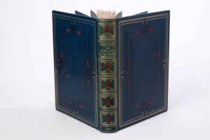 VIDAL. LOUYS (Pierre) / Les aventures du roi Pausole. Paris, Blaizot, 1906. In-4, maroquin bleu marine, dos à 5 nerfs saillants, auteur, titre et date dorés, caissons ornés de fleurons mosaïqués et à froid et bordés de filets dorés, décor des plats formé de plusieurs encadrements de filets dorés et à froid avec fleurons mosaïqués, double filet doré aux coupes et coiffes, contreplats bordé de maroquin orné d'une roulette florale encadrée par 2 filets, le tout doré, doubles gardes de satin moiré bleu et de papier marbré, tête dorée, non rogné, étui [Rainsford] (qq. petits frott. et une début de fente à l'étui). Nouvelle édition illustrée de 82 compositions en couleurs par Pierre Vidal. Tirage limité à 375 exemplaires: un des 50 sur japon (n°8), second papier après un exemplaire unique sur velin, comprenant une suite en noir sur Chine de toutes les lithographies. PROVENANCE Van Sikele, Belgique (Gand), XXe s. (ex-libris armorié)