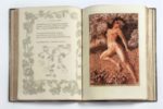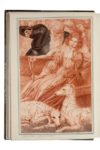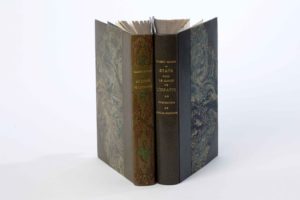 SCHWABE. SAMAIN (Albert) / Au jardin de l'infante. Paris, Le Livre contemporain, 1908. Deux volumes grand in-8. Édition illustré de 10 planches de Carlos Schwabe gravées sur bois par Beltran et tirées en couleurs, dont un frontispice, et de nombreux encadrements et culs-de-lampe à décor floral. Exemplaire d'exception composé de deux volumes. Le premier renferme l'ouvrage lui-même, dont le tirage a été limité à 120 exemplaires: celui-ci, n°7, est celui réservé à Louis Barthou. Il est enrichi de 2 dessins originaux signés de Carlos Schwabe: le frontispice, et la planche de l'hermaphrodite. Le frontispice se trouve en 5 états, dont 4 essais. On trouve relié à la fin du volume un grand nombre de planches tirées sur Chine, comprenant des décompositions des illustrations mais aussi des ornements et encadrements en 2 états. Ce volume est revêtu d'une reliure signée de Charles Meunier, demi-maroquin vert clair à coins, à la Bradel, dos lisse ornés d'un décor végétal mosaïqué, auteur et titre doré, couv. et dos conservés, non rogné (lég. frott. aux coins). Le second volume renferme une importante suite d'encadrements tirés sur Chine; relié par Marius Magnin, en demi-maroquin gris à la Bradel et à coins, dos lisse, auteur et titre dorés (lég. frott. aux coins). PROVENANCE Louis Barthou (pour le 1er vol.); puis Emile Bruell (ex-libris gravé vers 1920).