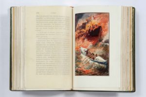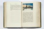 DES GACHONS. GÉNIAUX (Charles) / L'océan. Paris, Bibliothèque-Charpentier, E. Fasquelle, 1913. In-12, [3] f., 314 p., [1] f., maroquin vert anis, dos à 5 nerfs, auteur, titre et date dorés, caissons ornés, triple filet doré bordant les plats, double filet doré aux coupes, contreplat bordés de maroquin orné d'un jeu de roulettes, filets et fleurons dorés, doublure de satin moiré brun, seconde garde de papier marbré, couv. et dos conservés, tranches dorées sur témoins [Lortic], étui (dos lég. passé, étui frotté). Édition originale: un des 10 exemplaires sur Hollande (n° 9). Exemplaire unique enrichi de 19 aquarelles originales d'André Des Gachons, réalisées directement sur l'ouvrage, certaines hors-texte ou à pleine page, certaines signées de son monogramme. Mention autographe du peintre sous la justification: « illustré par André Des Gachons, 1914 »