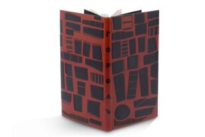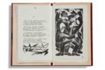GONTCHAROVA. ROUBAKINE (Nicolas) [La cité. En russe: Gorod]. Paris, [l'auteur], 1920. In-8, [3] f. (le premier blanc), 54 pages chiffrées imprimée d'un seul côté, [9] planches, fig., veau brun- roux, le dos lisse portant le titre russe mosaïqué, les plats décorés d'une composition formée de pièces de cuirs divers mosaïqués ou en relief, ainsi que de petites pièces de peau de serpent, doublure de box de même teinte, gardes de daim noir, non rogné, non coupé, monté sur onglets, couvertures conservées, chemise demi-veau et étuis assortis [Mathieu, Méli, Jolis] (petit frott. au bord de l'étui). Édition originale reproduisant le manuscrit des poèmes de l'auteur, en russe, illustré de 52 compositions de Natalia Gontcharova, dont 9 hors-texte. Tirage limité à 325 exemplaires: un des 25 exemplaires de tête sur vieux Chine (n° 4). Ouvrage très caractéristique des années parisiennes de Gontcharova, l'une des pionnières de l'abstraction, instigatrice avec Larionov du mouvement « rayonniste ». Reliure originale conçue par Monique Mathieu et exécutée en 1991 par M. Mélin et H. Jolis. (Rowell-Wye. The Russian Avant-Garde Book 1910-1934. New York: MoMA, 2002, n° 292)