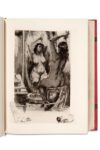 LOBEL-RICHE. MIRBEAU (Octave) / Le journal d'une femme de chambre. Paris, Javal et Bourdeaux, 1926. Grand in-4, 317 p., fig., maroquin vieux-rose, dos à 3 nerfs larges et plats, auteur, titre et date argentés, deux nerfs mosaïqués en partie prolongés sur les plats sous forme de listel évoquant un lacet de fermeture, tête dorée, non rogné, étui [Creuzevault] (accrocs à l'étui, teinte du nerf central passée). Édition illustrée de 20 eaux-fortes originales de Lobel-Riche. Tirage limité à 195 exemplaires sur vélin d'Arches comprenant les eaux-fortes en 3 états, dont l'eau-forte pure et un état avec remarques, celui-ci n° 150