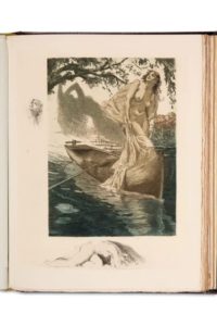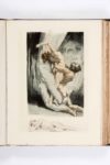 LOBEL-RICHE. POË (Edgar) / Vingt histoires extraordinaires... traduites par Charles Baudelaire. Paris, Le Livre de Plantin, 1927. Deux volumes in-4, chagrin brun, dos à 4 nerfs, auteur et titre dorés, filets dorés, plats encadrés d'un jeu de filets et fleurons dorés et pièces mosaïquées, tête dorée, non rogné (dos passé). Édition illustrée de 41 eaux-fortes originales par Lobel-Riche, dont 20 hors-texte. Tirage limité à 207 exemplaires: un des 15 sur vélin d'Arches (3e papier après un unique et 25 japon) comprenant l'eau-forte pure des vingt hors-texte, l'état noir avec remarques, l'état en couleurs avec remarques, l'état noir des lettrines avec remarques, une épreuve du frontispice avec sa remarques, l'état terminé, et un dessin original, au fusain et à la sanguine, signé, intitulé « Lionnerie ». Le second volume renferme les suites
