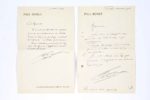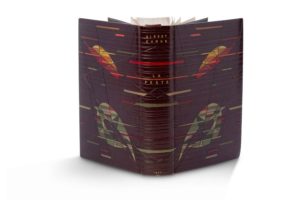 CAMUS (Albert) La peste. Paris, Gallimard, 1947. In-12, maroquin brun, dos lisse portant auteur, titre et date dorés, décor étendu au dos et aux plats, composé d'un jeu de filets à froid, et de listels et pièces géométriques mosaïqués, doublure et gardes daim vert bordées de maroquin, couvertures et dos conservés, tranches dorées sur témoins, chemise et étuis assortis [P. Bonet] (accroc à la coiffe de tête, dos de la chemise passé, petits frott. à l'étui). Édition originale tiré à 2345 exemplaires: un des 35 sur vélin de Hollande (second papier après 10 japon impérial), numéroté XXVIII. Splendide reliure de Paul Bonet, datée de 1958, parfaitement exécutée. Sont joints deux billets autographes signés du relieur, adressés à son commanditaire les 3 décembre 1858 et 9 janvier 1959, annonçant d'abord que la reliure est terminée, puis accusant réception du paiement