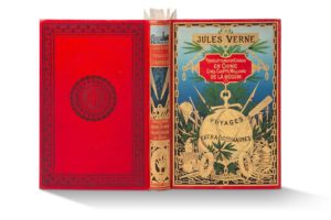 VERNE (Jules) Les tribulations d'un Chinois en Chine. Les 500 millions de la Bégum. Paris, Collection Hetzel, [1896-1904]. Grand in-8, cartonnage polychrome, 1er plat au globe doré, dos au phare, second plat de type q. Manque la pl.3 de la première partie. Taches p.76-79. Cartonnage frais, rare pour ce titre