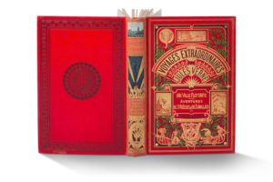 VERNE (Jules) Une ville flottante. Les forceurs de blocus. Aventures de 3 Russes et de 3 anglais. Paris, Collection Hetzel, [1905-1914]. Grand in-8, 6 planches, cartonnage polychrome, 1er plat à l'éventail et à un éléphant, titre dans le cartouche, dos au phare, second plat de type q. Dos passé mais bel exemplaire, intérieur intact, 1er plat très frais malgré une petite tache angulaire. Ex-libris manuscrit de 1908 sur la page de titre