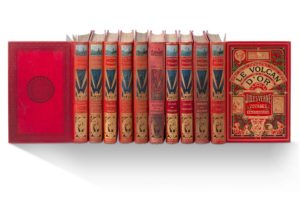 [LOT]. ENSEMBLE DE 10 VOLUMES DANS DES CARTONNAGES À L'ÉVENTAIL ET À UN ÉLÉPHANT - VERNE (Jules), Le pays des fourrures. Paris, Collection Hetzel, [1905-1914]. Grand in-8, 6 planches, cartonnage polychrome, 1er plat à l'éventail et à un éléphant, titre dans l'éventail, dos au phare, second plat type q. Marges brunies, cartonnage très frais y compris les tranches dorées. - VERNE (Jules). L'agence Thompson and Co. Paris, Collection Hetzel, [1908-1914]. Grand in-8, 12 planches, cartonnage polychrome, 1er plat à l'éventail et à un éléphant, titre dans l'éventail, dos au phare, second plat de type q. Dos passé, 1er plat très correct, 1ers cahiers un peu déréglés, qq. taches sporadiques. - VERNE (Jules). Le volcan d'or. Paris, Collection Hetzel, [1907-1910]. Grand in-8, 12 planches, cartonnage polychrome, 1er plat à l'éventail et à un éléphant, titre dans l'éventail, dos au phare, second plat de type q. Tache au plat inf., 1ers cahiers un peu déréglés, 1er plat très frais. - VERNE (Jules). La chasse au météore. Le pilote du Danube. Paris, Collection Hetzel, [1908]. Grand in-8, 12 planches, cartonnage polychrome, 1er plat à l'éventail et à un éléphant, titre dans l'éventail, dos au phare, 2e plat de type q. Dos un peu passé, coiffe de tête fendillée, 1er plat frais. - VERNE (Jules). L'invasion de la mer. Le phare du but du monde. Paris, Collection Hetzel, [1905]. Grand in-8, 12 planches, cartonnage polychrome, 1er plat à l'éventail et à un éléphant, titre dans l'éventail, dos au phare, 2e plat de type q. Dos un peu passé et frotté en tête, 1er cahier déréglé, rouss. au titre, bruniss. sporadique; 1er plat correct. - VERNE (Jules). La maison à vapeur. Voyage à travers d'Inde septentrionale. Paris, Collection Hetzel, Grand in-8, 6 planches, cartonnage polychrome, 1er plat à l'éventail et à un éléphant, titre dans le cartouche, dos au phare, second plat de type q. Charnières int. fendues mais cartonnage très correct. - VERNE (Jules). Robur-le-Conquérant. Un billet de loterie. Paris, Collection Hetzel, [1905-1914]. Grand in-8, 6 planches, cartonnage polychrome, 1er plat à l'éventail et à un éléphant, titre dans le cartouche, dos au phare, second plat de type q. Dos un peu défraîchi, 1er plat correct, qq. cahiers très lég. déréglés, brunissures. - VERNE (Jules). Vingt mille lieues sous les mers. Paris, Collection Hetzel, [1905-1910]. Grand in-8, 6 planches, cartonnage polychrome, 1er plat à l'éventail et à un éléphant, titre dans l'éventail, dos au phare, second plat type q. Défauts, dos restauré et réemboîté, 1er plat correct. - VERNE (Jules). L'étonnante aventure de la mission Barsac. Paris, Hachette (Collection Hetzel), [1919]. Grand in-8, cartonnage polychrome, 1er plat à l'éventail et à un éléphant, titre dans le cartouche, dos au phare, second plat de type r. Pertes de dorure au dos, 1er plat très correct. - VERNE (Jules). Hector Servadac. Voyages et aventures à travers le monde solaire. Paris, Collection Hetzel, [1905-1914]. Grand in-8, 6 planches, cartonnage polychrome, 1er plat à l'éventail et à un éléphant, titre dans le cartouche, dos au phare, second plat type q. Fente au mors sup., dos recollé, signature moderne au faux-titre, mais 1er plat et intérieur très frais. Soit 10 volumes