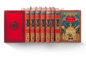 [LOT]. ENSEMBLE DE 7 VOLUMES DANS DES CARTONNAGES AU GLOBE DORÉ - VERNE (Jules). Kéraban-le-Têtu, Paris, Hetzel (Bibl. d'éducation et de récréation), [1896-1904]. Grand in-8, cartonnage polychrome, 1er plat au globe doré, dos au phare, second plat de type p. Cartonnage défraîchi, incomplet des planches. - VERNE (Jules). Deux ans de vacances. Paris, Collection Hetzel, [1896-1904]. Grand in-8, 8 planches, cartonnage polychrome, 1er plat au globe doré, dos au phare, second plat de type q. Dos un peu passé, 1er plat frais. - VERNE (Jules). Le superbe Orénoque. Paris, Collection Hetzel, [1899]. Grand in-8, 20 planches, cartonnage polychrome, 1er plat au globe doré, dos au phare, second plat de type p; catalogue AJ pour 1898-1899. Date d'après le catalogue. Coins et coiffes écrasés, qq. frott. au dos et plat; ex-dono moderne en marge de la première page. - VERNE (Jules). Le testament d'un excentrique. Paris, J. Hetzel et Cie (Collection Hetzel), [1900]. Grand in-8, 1 Carte, 1 pl. du jeu de l'oie, 20 planches, cartonnage polychrome, 1er plat au globe doré, dos au phare, second plat de type p.; catalogue AV pour 1899-1900. Date d'après le catalogue. Qq. frott. sur la dorure en bas du 1er plat; étiquette collée et signature au v° du frontispice. - VERNE (Jules). Les frères Kip. Paris, Collection Hetzel, [1902-1904]. Grand in-8, 12 planches, cartonnage polychrome, 1er plat au globe doré, dos au phare, second plat de type p. Petites taches aux plats et dos, petites griffures au plat sup; une charnière intérieure fendue - VERNE (Jules). Le tour du monde en quatre-vingt jours. Le docteur Ox. Paris, Collection Hetzel, [1896-1904]. Grand in-8, 7 planches, cartonnage polychrome, 1er plat au globe doré, dos au phare, second plat type p. Qq. saliss. et frott. légers aux plats et dos, qq. cahiers un peu déréglés, trous p.64. - VERNE (Jules). Seconde patrie. Paris, Hetzel (Bibl. d'éducation et de récréation), [1900-1904]. Grand in-8, 12 planches, cartonnage polychrome, 1er plat au globe doré, dos au phare, second plat type p.; catalogue BH non daté. Un coin écrasé, très petits manques de dorure; signatures modernes au faux-titre. Soit 7 volumes