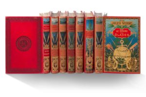 [LOT]. ENSEMBLE DE 7 VOLUMES DANS DES CARTONNAGES AU GLOBE DORÉ (6) ET À L'ANCRE (1) - VERNE (Jules), Bourses de voyage. Paris, Collection Hetzel, [1903-1904]. Grand in-8, 12 planches, cartonnage polychrome, 1er plat au globe doré, dos au phare, second plat type q. Dos un peu défraîchi, 1er plat très correct, charn. int. fendue et garde volante. - VERNE (Jules). Face au drapeau. Clovis Dardentor. Paris, Hetzel (Bibl. d'éducation et de récréation), [1897]. Grand in-8, 12 planches, cartonnage polychrome, 1er plat au globe doré, dos au phare, second plat type p; catalogue O pour 1896-97. Date d'après le catalogue. 1er plat et dos frottés, des ff. déreliés. - VERNE (Jules). Maître du monde. Un drame en Livonie. Paris, Collection Hetzel, [1904]. Grand in-8, 12 planches, cartonnage polychrome, 1er plat au globe doré, dos au phare, second plat type q. Exemplaire réemboîté, dos un peu passé, premier plat très correct. - VERNE (Jules). L'île mystérieuse. Paris, Hetzel (Bibl. d'éducation et de récréation), [1898-1914]. Grand in-8, cartonnage polychrome, 1er plat à l'ancre, dos à l'ancre, second plat de type p. Cart. restauré et réemboîté; qq. taches sporadiques; 1er plat frais. - VERNE (Jules). Voyages et aventures du capitaine Hatteras. Les Anglais au Pôle Nord. Le désert de glace. Paris, Hetzel (Bibl. d'éducation et de récréation), [1899]. Grand in-8, 6 planches, cartonnage polychrome, 1er plat au globe doré, dos au phare, second plat type p; catalogue AJ pour 1898- 99. Date d'après le catalogue. Dos défraîchi, plat sup. frotté. - VERNE (Jules). Le Sphinx des glaces. Paris, Hetzel (Bibl. d'éducation et de récréation), [1898]. Grand in-8, 20 planches, cartonnage polychrome, 1er plat au globe doré, dos au phare, second plat type p; catalogue Y pour 1897-98. Date d'après le catalogue. Dos passé, très légers frott. au 1er plat. - VERNE (Jules). Michel Strogoff. Moscou - Irkoutsk. Suivi de Un drame en Livonie. Paris, Hetzel (Bibl. d'éducation et de récréation), [1898]. Grand in-8, 8 planches, cartonnage polychrome, 1er plat au globe doré, dos au phare, second plat type p; catalogue Y pour 1897- 1898. Date d'après le catalogue. Ex. restauré et remonté, légèrement déréglé, une pl. déch. sans manque en marge, petits frott. au dos, 1er plat très correct. Soit 7 volumes