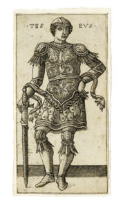 collezione Tammaro De Marinis. In alto al centro "TES / EUS". Questo foglio fa parte di una serie di quattro eroi dell'antichità, Achille, Troilo, Pirro e Teseo.