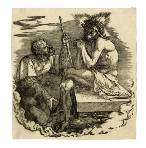 Albrecht DÜRER, Cristo, uomo dei dolori, deriso da un soldato. — 1511 [1580 ca.]. — Xilografia. mm 198x195. — Foglio : mm 212x200.