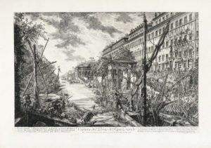 Giovanni Battista PIRANESI, Veduta del Porto di Ripa Grande. 1753. — Acquaforte. mm 405x618. — Foglio : mm 527x730.