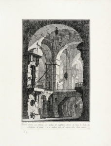 Robison, 3. Con la firma al margine sinistro in basso, il numero "2" in basso a destra nella didascalia e in alto a destra sopra la linea d'inquadramento. Da Prima parte di architetture e prospettive inventate ed incise da Gio. Batta Piranesi architetto veneziano dedicate al sig. Nicola Giobbe, opera composta da frontespizio e 12 tavole pubblicata per la prima volta a Roma dai fratelli Pagliarini nel 1743 e di nuovo in Opere varie da Bouchard nel 1750 con due tavole aggiuntive e il titolo cambiato. Bellissima prova nel V stato di 6 dalla terza edizione seconda uscita (1785 ca.-1799), stampata con inchiostrazione piena e brillante su carta vergellata pesante apparentemente priva di filigrana.