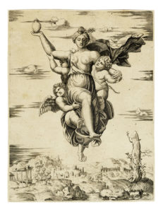 Marcantonio RAIMONDI [scuola di], Psiche portata in Olimpo da tre amorini. — 1515-1540. — Bulino. — mm 288x219. — Foglio : mm 294x223.