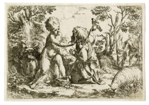 Guido RENI, Gesù Bambino e San Giovannino in un paesaggio con Maria e Giuseppe sullo sfondo. — 1600-1640. — Acquaforte. — mm 118x171. — Foglio : 125x176.