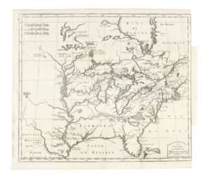 Bella mappa del Nord America che restituisce la regione dal fiume Mississippi e dai Grandi Laghi, riportati in scala gigante, fino alla costa orientale. Lungo il Mississippi sono presenti molti dettagli sui villaggi indiani e sugli insediamenti nell'alta valle del fiume, sebbene la foce sia qui posizionata molto più a ovest del suo vero corso, praticamente in Texas. Fort Miamis compare vicino all'attuale Chicago, nella regione e nei suoi dintorni sono presenti antichi nomi di luoghi e tribù indiane, il corso del fiume Hohio (Ohio) inizia nell'attuale Arkansas e prosegue verso est in direzione del Chesapeake, seguendo i Mons Apalache (Monti Appalachi), che si estendono a ovest fino al confine con l'Iowa e l'Illinois. Il Lago Huron è indicato come Karegnondi, un nome indigeno che significa grande lago o mare d'acqua dolce, si fa riferimento all'isola Manitoulin (la più grande isola d'acqua dolce del mondo) come "Cantolon". I villaggi indigeni sono riportati insieme agli insediamenti dei gesuiti. Le città francesi più importanti che si notano sono Quebec City e New Orleans. Cape Cod si chiama "Hollandia". (1)