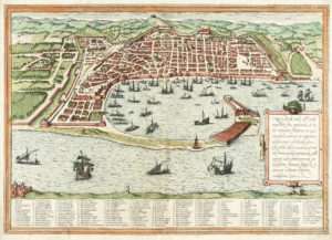 La veduta è dominata dall'intensa attività marittima del porto e dagli enormi magazzini in primo piano. La città è ben fortificata e protetta da cittadelle, soprattutto nella parte interna. Tra i luoghi notevoli la cattedrale di Maria Santissima Assunta (17) del XII secolo, con davanti la fontana di Orione (29) di Giovanni Angelo Montorsoli.
