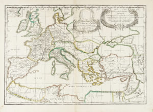 In alto a destra due cartigli decorativi per il titolo e l'autorialità, uno in francese più piccolo, l'altro in latino dove però ancora non compare la data "1660". Mappa storico-religiosa dell'Europa incisa da Jan van Somer (Amsterdam, 1645 - dopo il 1699 e prima del 1720), estesa fino a includere l'Africa settentrionale e una parte del Medio Oriente. Le ubicazioni dei concili e dei sinodi generali e provinciali sono indicate ovunque, sebbene la maggior parte dei dettagli si concentri in Francia. (1)