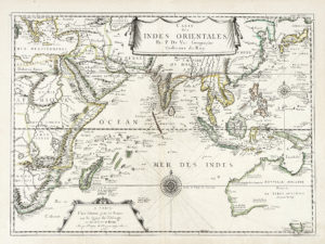 Incisione in rame in coloritura. mm 400x548. Foglio : mm 454x595. Mappa pubblicata in prima edizione nel 1665, dall'atlante di Duval Cartes de Geographie les Plus Nouvelles, raffigurante l'Oceano Indiano, dall'Australia e dal Sud Africa alla Cina e all'Asia Minore. Tra le prime mappe francesi a riportare le scoperte del XVII secolo in Australia, soprattutto le scoperte di Abel Tasman seguite ai suoi viaggi in Australia e Nuova Zelanda, dal 1642 al 1644. Vi sono rappresentati gli arcipelaghi dell'India orientale dell'Indonesia e delle Filippine e l'intera area tra il Capo di Buona Speranza e il Giappone e l'Australia, con la Tasmania che forma il limite meridionale a est. La mappa mostra anche le precedenti scoperte di Hartog, Cartensz e Nuyts in Australia. India, Indocina e penisola malese sono raffigurate sulla base delle carte nautiche olandesi del periodo. La forma dell'arcipelago indonesiano è in qualche modo corretta, non ancora la Nuova Guinea. Cina e Corea sono basate sui modelli di Thevenot. (1)