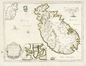 Pierre DUVAL, Les Isles de Malthe, Goze, Comin, Cominot, &c en La Mer Mediterranée par P. Du-Val, Géographe du Roy. — A Paris : Chez l'Auteur, sur le Quay del'Orloge pres le Palais, 1667. — Incisione in rame con confini in coloritura. — mm...