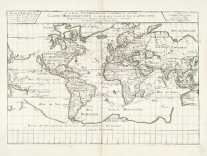Mappa in proiezione piana che riporta le più importanti rotte commerciali mondiali alla metà del XVII secolo : vi figurano le vie da e per le "Indies Occidentales" e le "Indes Orientales", con piccoli velieri posizionati su ciascuna rotta, si tratta per lo più delle rotte percorse dalle navi francesi e inglesi, piuttosto che quelle più a sud attraverso l'Oceano Indiano, e poi verso nord, preferite dagli olandesi. Suggestiva la rappresentazione di "Terres Ant-Arctiques dites Australes et Magellaniques et Inconnues" che conserva gran parte delle informazioni mitiche comuni nelle mappe del XVI secolo, compresi i luoghi resi popolari da Marco Polo, come i Regni di Psitac (abbreviazione di Psitacorum, la Terra dei Pappagalli), Beach, Lucac e Maletur (il Regno di Malaiur o Malesi, che fu posto da Marco Polo all'estremità sud-orientale della penisola malese). (1)