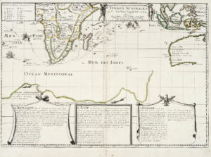 Bella mappa del Sud Africa dell'Indonesia e dell'Australia, ovvero delle scoperte olandesi nella Nuova Olanda e nell'Oceano Indiano con evidenziati i percorsi commerciali da e verso le Indie Orientali. Il fulcro della carta sono però le terre più a sud e ad est dell'India e delle Indie Orientali. Piccole navi sono posizionate lungo le rotte commerciali che circumnavigano l'Africa e collegano l'India e il Sud-Est asiatico al commercio europeo. Entrambe le zone geografiche sono dense di toponimi e posizionate nella parte superiore della mappa. I due terzi inferiori sono riservati alla vastità dell'Oceano Indiano meridionale e al suo continente corrispondente. Tavola in basso a destra della mappa del mondo in quattro fogli di Duval. Il titolo poteva essere tagliato quando i quattro fogli venivano uniti per formare un'unica grande mappa. (1)