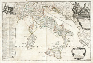 Con la firma dell'incisore Antonio Barbey sulla lastra in basso a destra. Carta dell'Italia ecclesiastica, incisa da Antonio Barbey (notizie seconda metà sec. XVII) seguendo il rilievo del Padre agostiniano Augustin Lubin, umanista e teologo oltreché geografo della corona di Francia. La mappa venne pubblicata da Domenico De Rossi subentrato nell'azienda di famiglia dopo la morte del padre, Giovanni Giacomo, avvenuta l'anno di uscita di questa mappa. In alto a destra grande cartiglio dedicatorio con armi papali e titolo, in basso la scala miliaria con le indicazioni editoriali e sul lato sinistro ampia legenda con la nomenclatura delle varie sedi ecclesiastiche. (1)
