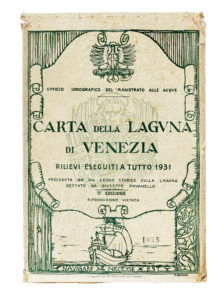 Litografia a colori. mm 450x590. SI AGGIUNGONO : Carta della Laguna di Venezia rilievi eseguiti a tutto 1931 preceduta da un cenno storico sulla laguna dettato da Giuseppe Pavanello.