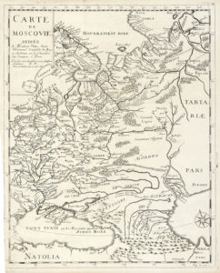 Mappa della parte occidentale della Russia dall'edizione francese del 1659 di Relation du voyage d'Oléarius Adam en Moscovie, Tartarie, et Perse avec celui de I.A. De Mandelslo aux Indes Orientales traduit de l'Allemand et augmenté par A. de Wicquefort. . Ambasciatore a Mosca e successivamente in Persia, Olearius si adoperò per assicurare a Federico III di Holstein-Gottorp una posizione favorevole relativamente alla Via della Seta. La discesa del Volga da parte della sua spedizione portò alla prima mappatura dettagliata del fiume, e il resoconto della spedizione di Olearius, pubblicato per la prima volta in tedesco nel 1646 e tradotto in francese nel 1656 e di nuovo nel 1659, è uno dei primi importanti rapporti sul paese. Intagliata a Parigi da un incisore identificato dal monogramma D.P. nel cartiglio del titolo, la carta è una delle prime raffiguranti la Russia pubblicate in Francia da un diario di viaggio di prima mano. (1)